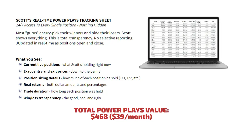 Daily Power Play Alerts — Scott’s specific trade plans every time he buys or sells a Power Play. Each alert using Scott’s time-tested 8/21 framework — the same systematic process that spotted BULL (+40.2%), UMAC (+37.4%), and ASTS (+34.6%). Value: $39/month